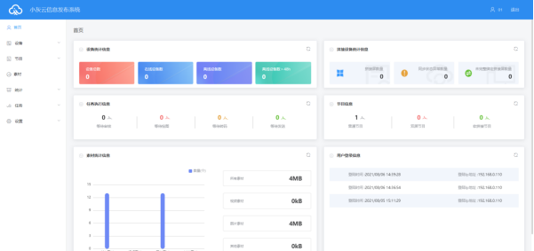 系統模塊LCD小灰云信息發布系統采用B/S系統架構,含有首頁、設備、節目、素材、統計、任務和設置模塊。圖1-1系統管理模塊?登陸界面:用戶登陸、切換語言等。?首頁:設備統計信息、拼接設備統計信息、任務執行信息、節目信息、素材統計信息、用戶登錄信息。?設備:設備分組、設備上/下線狀態、時間校正、亮度調整、固件升級等操作,設備“詳情”中可以看到設備運行狀態信息、節目信息、發布記錄和上下線記錄等。?節目:包含單個節目和節目單設置,新建節目、節目編輯、節目預覽、節目發布等操作。節目列表中可查看節目“發布記錄”、播控設置和GPS定點播放等。?素材:上傳視頻、圖片、GIF動畫、Word、PPT、表格、待審...